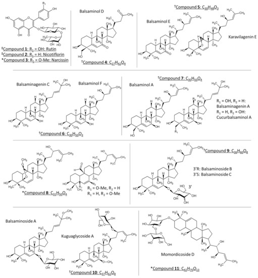 The chemical structures of the compounds identified in M. balsamina in the present work. Compounds marked with ‡ (1 and 2) have been tentatively identified in M. balsamina using LC-MS, whereas compounds marked with † have been previously isolated and characterized in M. balsamina. Lastly, compounds symbolized with * have been tentatively identified in the present work based on high and low collisional energy mass spectrometry and ultraviolet spectroscopy. Compounds 5–8 and 10 with similar molecular formulas are grouped together.