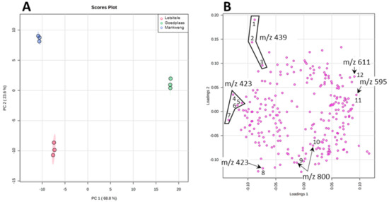 In order to statistically differentiate between these geographical samples, we applied XCMS for preliminary data processing involving future detection, retention time correction and peak alignment [48,49,50]. Using the XCMS parameters specified section in Section 3.5 (data processing and statistical analysis), 823 features were identified and exported as an excel spreadsheet. A manual inspection of the exported data set was done using the knowledge that was gained during the MS characterization of the compounds, in particular, the adduct and product ion formation. Therefore, a single feature manifesting as multiple features due to adduct or product ion formation as well as isotopic peaks were identified and edited so that each compound is represented by a single feature. Following this amendment, a total of 286 features were left and uploaded into MetaboAnalyst for statistical analysis [51]. PCA score plot displayed in Figure 4A revealed a clear separation between the three chemotypes: Letsitele, Goedplaas and Mankweng. The two principal components of the PCA score plot, PC1 (68.8%) and PC2 (23.6%) represented a substantial 92.4% of the variance. Examining the PCA loadings plot (Figure 4B) revealed that some of the biggest contributors to PC1 are the flavonoid glycosides, rutin (1) and nicotiferin (2) and compound 6 (m/z 423). PC1 also explains the largest variance between Goedplaas on the one hand and Letsitele and Mankweng chemotypes on the other hand.