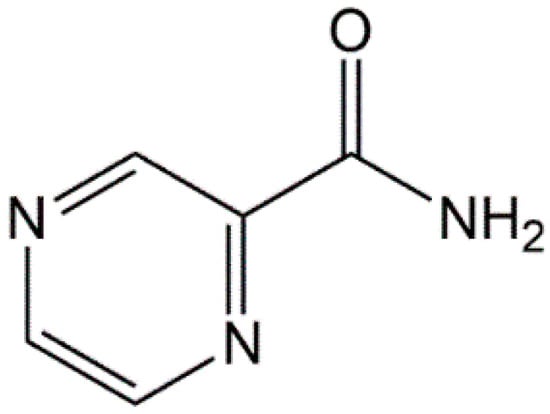 Pyrazinamide (Figure 1) is an antimycobacterial agent, with a well-established function as a front-line drug against tuberculosis that presents the most effective tuberculosis chemotherapy along with isoniazid, rifampicin, and ethambutol [1,2]. Indeed, the use of pyrazinamide in the treatment of tuberculosis [1] is recommend by the World Health Organization (WHO) [3] and it is in the WHO Model List of Essential Medicines [4].