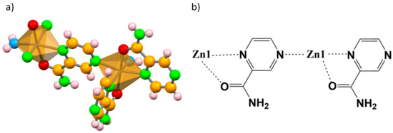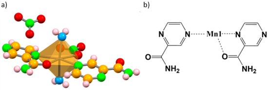 Accordingly, the development of new pyrazinamide coordination frameworks recurring to biocompatible metals envisaging synergistic effects can be explored as a viable pathway for the improvement of its antimycobacterial properties. A systematic analysis in the Cambridge Structural Database (CSD) [34] retrieved 48 pyrazinamide-based coordination compounds. Nevertheless, from this universe, the evaluation of the biological activity was studied only for a few compounds, which enclose Mn(II) and dicyanamide as the second ligand [35]; complexes of Cu(II), Fe(II), Co(II), Mn(II), and Ni(II) [36], and of Au(I) and Au(III) [37]. Some of these compounds were demonstrated to be more effective against M. tuberculosis than the free pyrazinamide, proving the potential of these systems for the improvement of the antimycobacterial properties of pyrazinamide.