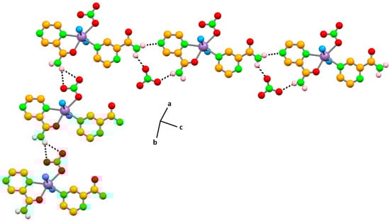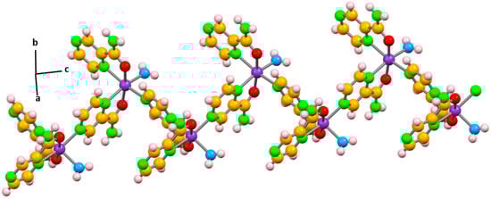 One of the pyrazinamide ligands bridged the consecutive Zn(II) metal centers, promoting the formation of a 1D framework with zig-zag chains aligning along the c axis. The other crystallographically independent pyrazinamide coordinated to a single Zn(II) center, precluding the formation of 2D frameworks (Figure 3).
