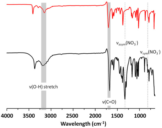 Comparison of the FTIR spectra of pyrazinamide and 2 confirmed the presence of the coordinated water molecules, as the ν(O-H) stretch at ~3250 cm−1 was observed. The shift from 1704 to 1673 cm−1 of the carbonyl band confirmed that the carbonyl group participates in the coordination to Mn(II). In addition, the νasym(NO3−) and νsym(NO3−) stretching vibrations centered at ca. 1329 and 814 cm−1 ascertained the presence of the coordinated nitrate (Figure 8).
