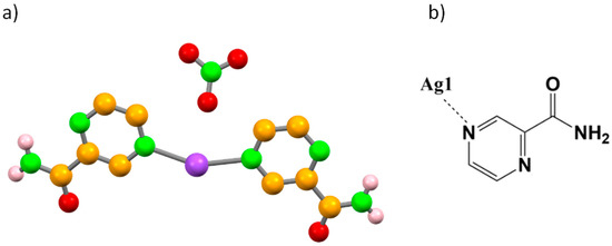 The asymmetric unit of 3 was composed by a half Ag(I) metal center, one pyrazinamide molecule and half a non-coordinated nitrate. The Ag(I) metal center assumed a distorted linear geometry (N-Ag-N 154.1(3) °) coordinating to two pyrazinamide ligands by the pyrazine-N atom (2.230(5) Å) and giving rise to [Ag(PYR)2]+ ions (Figure 9a,b and Table S3).