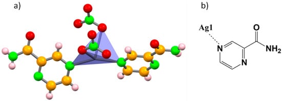 The asymmetric unit of 4 was formed by half Ag(I) metal center, one pyrazinamide molecule, and half a coordinated nitrate. The coordination of the nitrate precluded the linear geometry observed in 3, and thus, in 4, the Ag(I) metal center assumed a distorted tetrahedral geometry, coordinating to two pyrazinamide ligands by the pyrazine-N atom (2.227(4) Å) and two nitrates (2.227(4) Å) (Figure 11a,b, and Table S4). It is noteworthy that the coordination mode of pyrazinamide was maintained in 3 and 4.