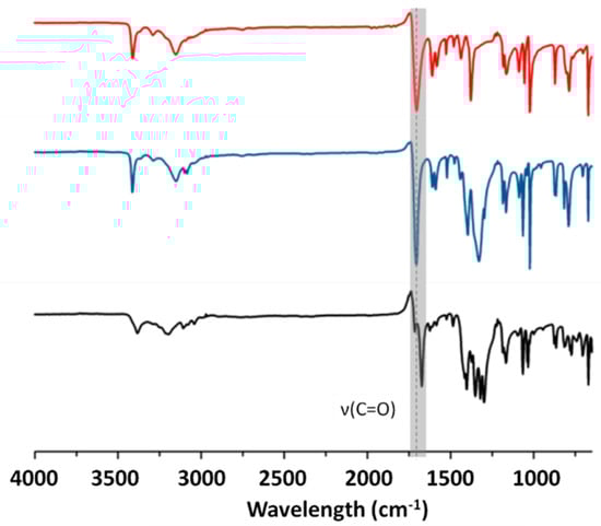 Regarding the FTIR spectrum of 3, it was possible to confirm that the carbonyl group did not participate in coordination to Ag(I), with its band being registered at 1704 cm−1 (Figure 13). On the other hand, a small peak was detected at 1704 cm−1 and a more intense peak appeared at 1674 cm−1 in the spectrum of 5 (Figure 13), and therefore this shifted peak might indicate that the coordination via the carbonyl group was a possibility in 5, as seen in 1 and 2.