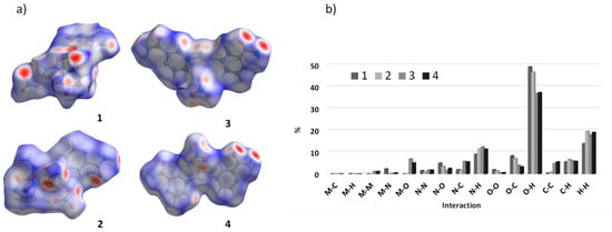 Hirshfeld surfaces for 1–4 (a), and graphical representation of the percentage of the various intermolecular contacts contributing to the Hirshfeld surfaces for 1–4 (b). Reciprocal contacts are included.