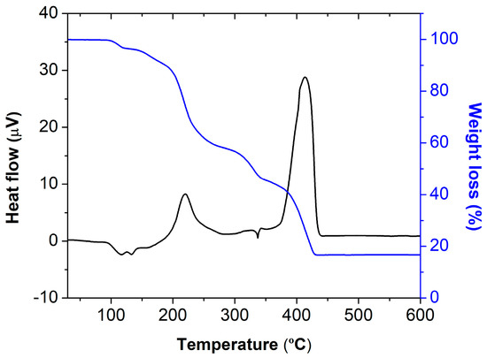 Combined Thermogravimetric Analysis–Differential Scanning Calorimetric (TGA–DSC) were carried out using a Setsys Evo 16 SETARAM TG-DTA 92 thermobalance (Caluire, France) under air flow, with a heating rate of 10 °C min−1. The samples weights were in the 8–20 mg range.