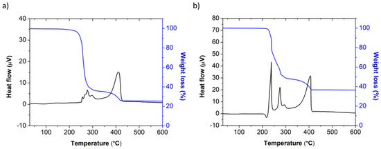 DSC (black) and TGA (blue) of (a) 3 and (b) 5.