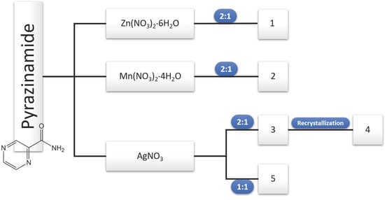 Summary of the neat grinding reaction conditions, depicting the stoichiometric ratios of pyrazinamide:metal salt used for the synthesis of compounds 1-3, and 5; 4 was obtained by the recrystallization of 3.