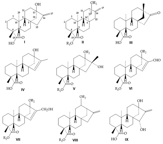 The DGs under acidic conditions may undergo double bond isomerization, sugar cleavage from the glycosides, and Wagner-Meerwein rearrangement of the diterpene aglycone portion depending on temperature. The acid hydrolysis of DGs has been studied since several soft drinks and juices prepared with DGs from S. rebaudiana as sweeteners can produce undesirable products under inappropriate temperature storage that may affect the taste of these acidic beverages. Even under different mild acid conditions a double bond isomerization process occurs yielding some by-products that have been isolated and characterized [33,34,35,36,37,38,39]. However, proper high-resolution analytical methods need to be developed to differentiate natural DGs from their endocyclic isomer compounds since they elute very closely in HPLC [40]. Additionally, a cleavage of all the sugars in DGs occurs under strong acid conditions producing a mixture of at least three main aglycones from this reaction: isosteviol (major), the endo steviol isomer and steviol (as very minor component). Hence, acid hydrolysis is not a good method to produce steviol in quantities. Recently, these three structurally close aglycones have been purified in their intact form by a two-step gradient high-performance silica gel chromatography [38]. In Table 1 are shown all the DGs formed under basic or acidic conditions while all the aglycones produced from steviol glycosides under acidic conditions and others reported from S. rebaudiana are compiled in Figure 1.