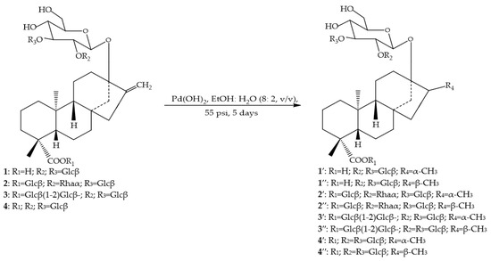 Catalytic hydrogenation of the exocyclic olefinic bond has also been studied in detail for some DGs and the sensory evaluation of their derivatives has also been reported. In this reaction, both isomers, α-CH3 and β-CH3 at position C-16 of the aglycone have been obtained and characterized Figure 2.