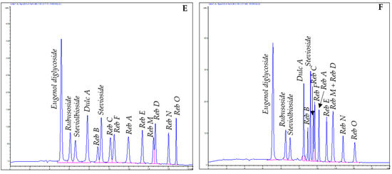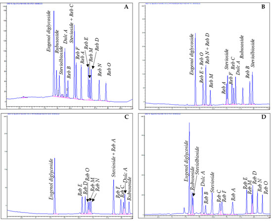 Steviolmonoside (Stev-mono); Iso-steviolbioside (Iso-Stevbio); Rubusoside (Rub); Steviolbioside (Stev-bio), Stevioside (Stev); Iso-Steviolbioside (Iso-Stevbio); Iso-Stevioside (Iso-Stev); Rebaudioside G1 (Reb G1); Rebaudioside G (Reb G); Dulcoside A1 (Dulc A1); Dulcoside A (Dulc A); Rebaudioside B (Reb B); Rebaudioside A (Reb A); Iso-Rebaudioside A1 (Iso-Reb A1); Iso-Rebaudioside A (Iso-Reb A); Dulcoside B (Dulc B); Rebaudioside C (Reb C); Rebaudioside F1 (Reb F1); Rebaudioside F (Reb F); Rebaudioside L1 (Reb L1); Rebaudioside L (Reb L); Rebaudioside H (Reb H); Rebaudioside H1 (Reb H1); a: 13-[(2-O-β-d-glucopyranosyl-3-O-β-d-glucopyranosyl-β-d-glucopyranosyl) oxy]ent-hydroxyatis-16-en-19-oic acid -β-d-glucopyranosy ester; b: 13-[(2-O-β-D-xylopyranosyl-β-D-glucopyranosyl-)oxy]ent-kaur-16-en-19-oic acid β-D-glucopyranosyl ester; c: 13-[(2-O-β-d-glucopyranosyl-3-O-β-d-glucopyranosyl-β-d-glucopyranosyl) oxy]ent-hydroxyatis-16-en-19-oic acid; d: 13-[(2-O-6-deoxy-β-D-glucopyranosyl-3-O-β-D-glucopyranosyl-β-D-glucopyranosyl)oxy]ent-kaur-16-en-19-oic acid β-D-glucopyranosyl ester; e: 13-[(2-O-β-D-xylopyranosyl-β-D-glucopyranosyl-)oxy]kaur-16-en-19-oic acid; f: 13-[(2-O-6-deoxy-β-D-glucopyranosyl-3-O-β-D-glucopyranosyl-β-D-glucopyranosyl)oxy]kaur-16-en-19-oic acid.