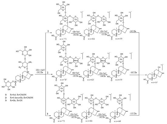 In contrast to the C-19 moiety, a broad cleavage of the C-13 moieties in DGs occurs at 70 eV. In branched trisaccharides at C-13, sugars at C-3 cleave first, followed by sugars at C-2 and finally sugars directly linked at C-13. The dissociation pattern of three tetraglycosides with a glucose attached at C-19 and deoxyGlcβ(1-2)[Glcβ(1-3)]Glcβ1- (13-[(2-O-6-deoxy-β-D-glucopyranosyl-3-O-β-D-glucopyranosyl-D-glucopyranosyl) oxy]ent-kaur-16-en-19-oic acid β-D-glucopyranosyl ester), Xylβ(1-2)[Glcβ(1-3)]Glcβ1- (rebaudioside F) and Glcβ(1-2)[Glcβ(1-3)]Xylβ1- (rebaudioside R) are three DG examples that allow the understanding of the sequential loss of each sugar unit from C-13 (Figure 5).