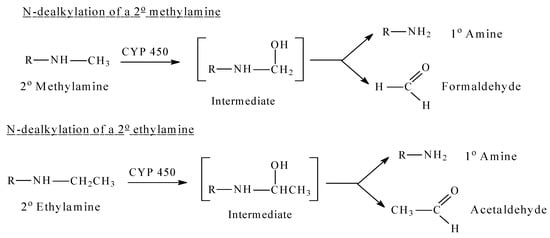 Mechanistically, CYP450-catalyzed N-dealkylation involves as a first step the hydroxylation of the carbon atom of the alkyl group that is linked to the nitrogen atom (α-carbon atom). This hydroxylated metabolite is unstable. It breaks spontaneously into two molecules: the dealkylated metabolite (e.g., an amine), and an aldehyde (e.g., formaldehyde after demethylation, acetaldehyde after deethylation, etc.) [1]. The reaction is shown for methyl and ethyl secondary amines in Figure 1, which can be aliphatic or heterocyclic (or aromatic). Similarly, tertiary amines are dealkylated in a similar way by consecutive hydroxylation of the alkyl groups at the carbon that is linked to the nitrogen atom [1].