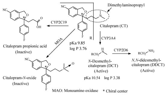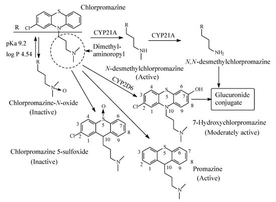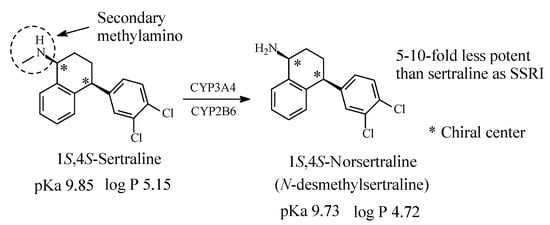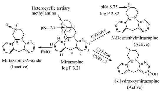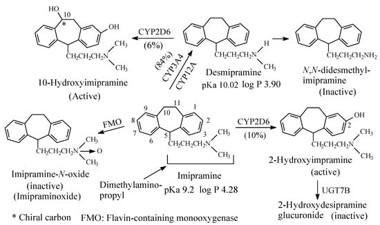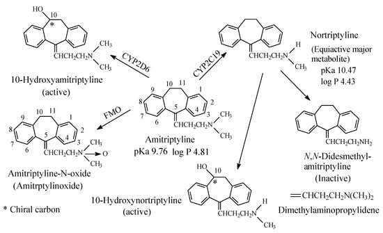 Both imipramine and amitriptyline (Figure 3 and Figure 4, respectively) are aliphatic tertiary-amine tricyclic antidepressants. The two drugs are metabolized by N-demethylation to equiactive secondary-amine metabolites, desmipramine and nortriptyline, respectively, as shown in Figure 3 and Figure 4 [4,5,6,7,8]. The latter two drugs are further metabolized by N-demethylation to inactive primary amine metabolites [9]. Hydroxylation is also an important metabolic pathway of the four drugs (Figure 3 and Figure 4).