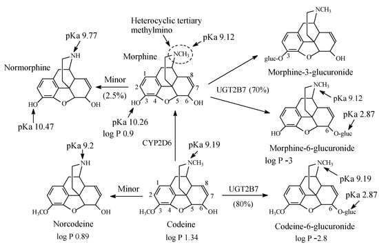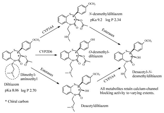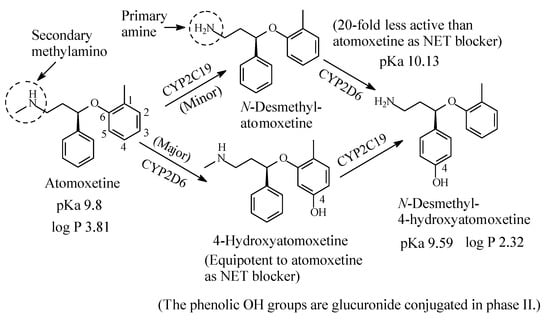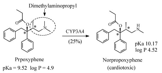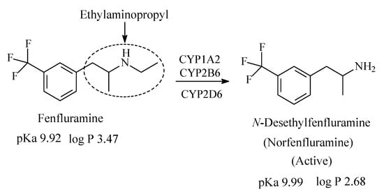 Venlafaxine (Figure 6) is an antidepressant drug that acts as both serotonin and norepinephrine reuptake inhibitor. It contains a dimethylaminomethyl moiety. The metabolic pathways of venlafaxine are depicted in Figure 6 [16,17,18,19]. While O-desmethylvenlafaxine is equiactive and equipotent with the parent drug as antidepressant and has been developed into a drug of its own right under the name of desvenlafaxine, N-desmethylvenlafaxine is devoid of antidepressant activity [20,21]. The pKa and log p values of venlafaxine and desvenlafaxine are given in Figure 6.