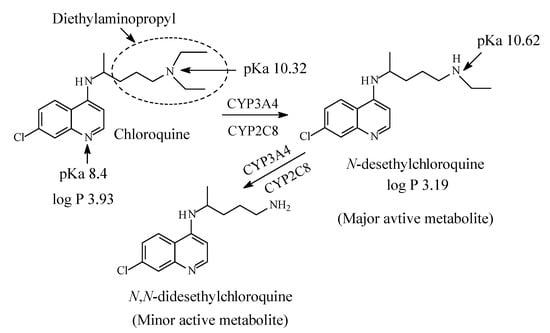 - Kim, K.A.; Park, J.Y.; Lee, J.S.; Lim, S. Cytochrome P450 2C8 and CYP3A4/5 are involved in chloroquine metabolism in human liver microsomes. Arch. Pharm. Res. 2003, 26, 631–637. [Google Scholar] [CrossRef]