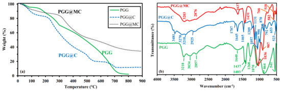 Characterization of PGG, PGG@C and PGG@MC materials: (a) TGA curves, (b) FTIR spectra.