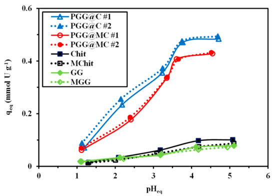 The sorption process is frequently associated with pH changes that may be caused by proton binding or release on the sorbent and/or U(VI) equilibrium displacement due to metal binding. Figure S8 shows the pH variation occurring during metal sorption. At pH below 3.5, the equilibrium pH tends to slightly increase (by less than 0.5 pH unit) for all the sorbents. Above pH 3.5, the pH is almost not affected by metal sorption in the case of Chit, MChit, GG and MGG while for phosphorylated sorbents the pH tends to decrease by 0.5 pH unit. The formation and partial binding of hydrolyzed species (which shifts uranyl speciation) may explain this pH decrease. The distribution ratio (D = qeq/Ceq, L g−1) increases with equilibrium pH (Figure S9); its log10 plot may be used, in ion-exchange processes, for evaluating the stoichiometric exchange ratio between metal ions and protons through the determination of the slope. In the case of PGG@C and PGG@MC, the slope is closed to +0.5, meaning that two protons may be exchanged with one uranyl ion (Figure S9). In the case of Chit and MChit, the slope is close to +0.23–0.24, while for GG and MGG the slope tends to +0.17 (not shown). The phosphonate reactive groups involve different modes of interaction with uranyl than the raw biopolymers.