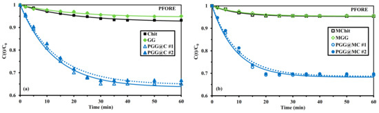 Under selected experimental conditions, the uptake kinetics is relatively fast: about 50 min for raw Chit and GG polymers and 30 min for phosphorylated materials (Figure 5). It is noteworthy that the incorporation of magnetite nanoparticles allows reducing the equilibrium time to 40 min for raw polymers and 20 min for PGG@MC. This beneficial effect of magnetite NPs counterbalances the slight reduction in sorption capacities at equilibrium (Table 1).