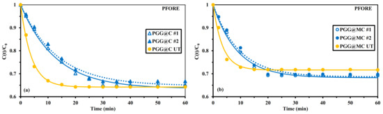 Figure 6 confirms the enhancement of mass transfer properties when applying ultrasonic treatment (power: 160 W; frequency: 25 kHz): the equilibrium time decreases to 15 min (more than 98% of total sorption occurs within the first 10 min) and the initial slope of the kinetic profile is strongly increased. The apparent rate coefficients are significantly improved while using UT: from 7.69 ± 0.15 × 10−2 min−1 to 25.6 × 10−2 min−1 in the case of PGG@C and from 10.9 ± 0.4 × 10−2 min−1 to 28.7 × 10−2 min−1 in the case of PGG@MC. However, it is important reporting that the ultrasonic treatment hardly affects the sorption capacity at equilibrium for PGG@C (∆: −2%) while the sorption capacity decreases by 16% for PGG@MC. The ultrasonic activation is not really justified for the magnetic sorbent. It is noteworthy that the UT improves the fitting of experimental profiles by the PFORE. Figures S12 and S13 reports the modeling of kinetic profiles with the PSORE and the RIDE, respectively. The enhancement of mass transfer is also confirmed by the increase in the effective diffusivity (by a factor 2.4–2.8) when the system was submitted to UT (Table 1).