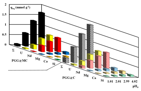 The quasi-linear increase in the sorption capacity with the pH (below pHeq 4, which is below the pHPZC of both PGG@C and PGG@MC) is directly correlated with the progressive deprotonation of reactive groups at the surface of the sorbent. Figure S7 shows the large predominance of free UO22+ species at pH below 4; with progressive appearance of hydrolyzed and polynuclear species at pH 3.5. All the species present in solution are cationic causing electrostatic repulsion with protonated reactive groups; increasing the pH progressively reduces this repulsion: the sorption capacity increases. The stabilization at pH superior to 3.7 for PGG@C and PGG@MC may be correlated with the appearance of polynuclear species. In the case of uranyl sorption on fungal biomass, the most reactive groups are amine groups of chitosan-based constituent of the cell wall; Guibal et al. [86] showed the preference of these amine groups for polynuclear uranyl species. In the present case, the amine groups of chitosan may contribute to uranyl binding; however, phosphonate appear to be more reactive and to have marked preference for free-uranyl species because of the effects of steric hindrance and differential affinity.