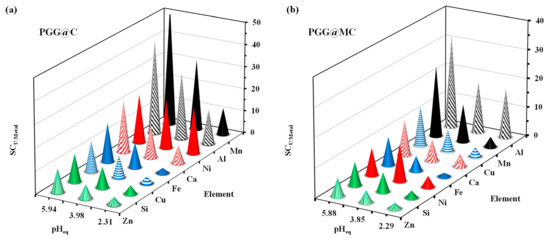 The measurements of specific surface area (SBET, m2 g−1) and porous volume (Vp, cm3 g−1) for PGG@C and PGG@MC clearly show the beneficial effect of the incorporation of magnetite NPs on the textural properties of the sorbent. Indeed, the textural parameters increase by one order of magnitude in the presence of magnetite NPs: SBET increases from 5.06 m2 g−1 for PGG@C to 80 m2 g−1 for PGG@MC, while the porous volume reaches 26.4 cm3 g−1 for PGG@MC (against only 1.66 cm3 g−1 for PGG@C).