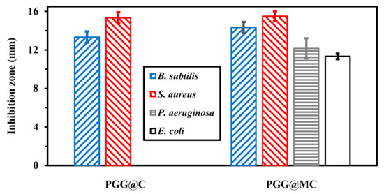 The antibacterial activity of prepared composite (PGG@C and PGG@MC) was assessed using the agar well diffusion method against Bacillus subtilis ATCC6633, Staphylococcus aureus ATCC6538 as Gram+ bacteria, and Escherichia coli ATCC8739, Pseudomonas aeruginosa ATCC9022 as Gram− bacteria. Each bacterial species was individually streaked on Muller Hinton agar plate (ready prepared, Oxoid, Thermo Fisher Scentific, UK) using sterilized cotton swaps. Wells (0.8 mm in diameters) were prepared onto the inoculated plated before being filled with 100 µL of suspension (400 µg/1.0 mL DMSO). The plates were kept in the refrigerator (i.e., 4 °C) for 1 h, followed by incubation at 37 °C for 24 h. The results were recorded as the diameter of the zone of inhibition (ZOI) formed around each well by mm [70]. DMSO was running with the experiment as negative control. The ZOI was expressed as the mean ± standard deviation of three independent replicates. Data were subjected to analysis of variance (ANOVA) by the statistical package SPSS v17 (IBM, Armonk, NY, USA). The mean difference comparison between the treatments was analyzed by the Tukey HSD test at p < 0.05.