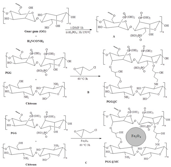 Guar gum (1 g) was dissolved in DMF (55 mL before adding urea (15 g) under continuous agitation and until of the reagents were completely dissolved. The mixture was heated (under reflux) at 110 ± 5 °C for one hour. After cooling, phosphoric acid (13 mL, 85% w/w) mixed with DMF (20 mL), was dropped into the previous mixture and the temperature was risen to 150 °C for three hours. The precipitate was collected by vacuum filtration, washed with absolute ethanol before being air-dried to produce phosphorylated guar gum (PGG) as a dense white precipitation; the conversion yield reached 95%, in terms of mass balance, the amount of precipitate was close to 17 g (See Panel A in Scheme 1).
