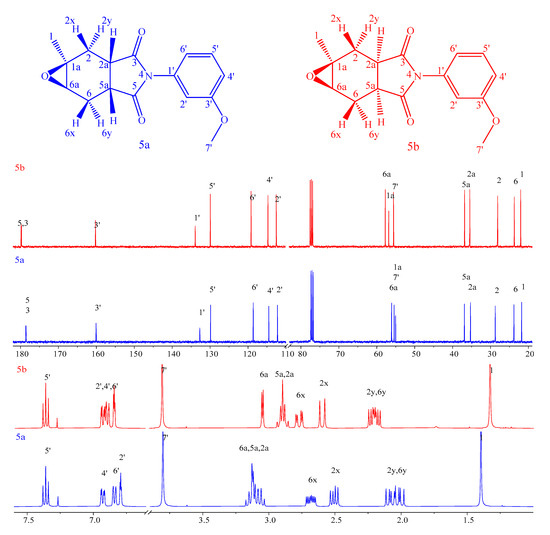 The carbon atoms of compound 5a were fully assigned using DEPT (Distortionless Enhancement by Polarization transfer, Figure S15), HMQC (Figure S18), and HMBC (Figure S19) spectra. 1H and 13C NMR spectra of compounds 5a and 5b are presented in Figure 2.