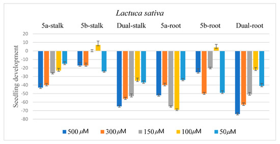 Assessing the development of lettuce seeds (Figure 4), all substances interfered with the growth of the aerial and root parts of the seeds; however, the results observed for the root were more satisfactory. In general, substance 5a presented better inhibition results than substance 5b. At the concentration of 500 μM, substance 5a presented inhibition of 43% of the aerial and 52% of the root parts. At the concentration of 100 μM, substance 5a was the most active, even compared with the positive control, with 69% roots inhibition.