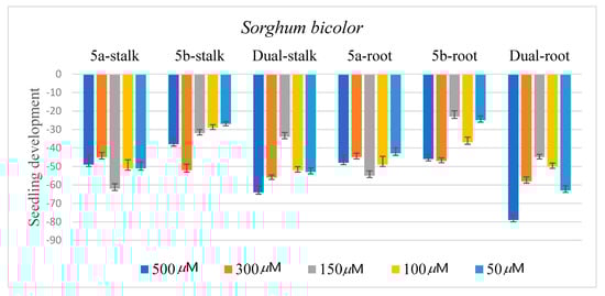 Evaluating the development of sorghum seeds (Figure 6), all substances interfered with the growth of the aerial and root parts of the seeds; however, substance 5a presented better inhibition results, in general, compared with substance 5b. At the concentration of 500 μM, substance 5a presented close to 50% inhibition of stem and root parts of sorghum. At 150 μM, substance 5a presented more than 55% inhibition of the roots and stems—results superior to that presented by the commercial herbicide at the same concentration.