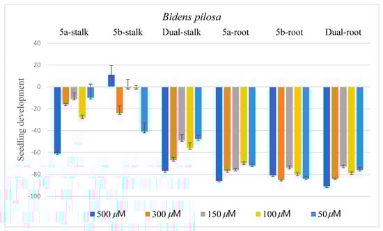 Assessing the development of the weed Bidens pilosa (beggartick) seeds, both epoxides affected their development (Figure 7). Epoxide 5a presented better inhibition of the stalk and root parts of beggartick than 5b at the concentration of 500 μM. At 500 μM, 5a and 5b presented 86% and 81% inhibition of the root parts of beggartick, respectively. The herbicide activity, displayed by 5a and 5b, was comparable with those presented by Dual.