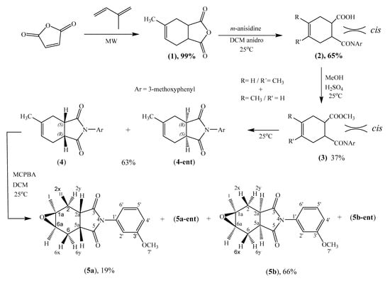 Therefore, we decided to use the known Diels–Alder reaction to prepare the tetrahydrophthalimide (4) in three steps, which was converted into the epoxy compounds (5a and 5b). From this reaction, we obtained two novel pairs of diastereomers whose relative configurations were determined by comparison of the experimental with the computed NMR chemical shifts.