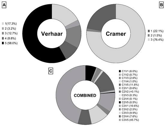 Distribution of chemicals (n = 3728) in the curated EnviroTox: (A) Verhaar classes, (B) Cramer classes, (C) combined classification (C = Cramer, V = Verhaar).