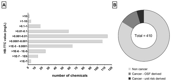 Compound-specific HB-TTCs for 410 chemicals: (A) distribution of values, (B) toxicological features. OSF = Oral Slope Factor.