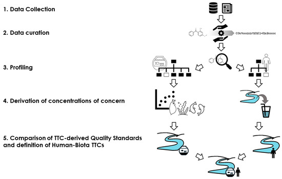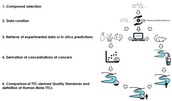 The aim of this study was to develop a strategy for the definition of generic and compound-specific HB-TTCs for the aquatic environment as safe freshwater concentrations for human and ecological receptors at the same time, using public data and the in silico tools implemented in the VEGAHUB platform (www.vegahub.eu (accessed on 1 March 2021)).