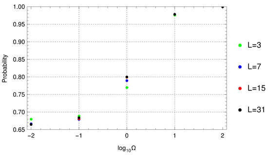 In order to study crystals, we should let the number of cells, L, become very large. However, in computing the probability, , Equation (2), becomes more time-consuming as L increases. Fortunately, the convergence with L is fast, as can be seen in Figure 2 where is shown for different values of L and . Note that already gives a reasonable estimate for ; this is the value for L chosen below.