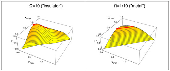 Let us now turn our attention to the domain maximizing P, , Equation (3). Figure 3 shows the value of P as a function of and . Independently of the opacity, , one finds that it is defined by an interval between , and . As in Figure 2, we see that the maximal value of P increases with . Note that another feature is present, too. Meanwhile, for large values of the maximum of is well characterized; for small values of , a translation of the domain by some — i.e., and — has almost no effect. Of course, when the wall disappears, translational invariance requires that there strictly is no effect when translating by some .