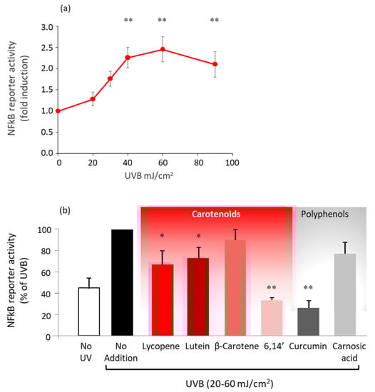 The NFκB transcription system is activated during inflammation, and UV irradiation is known to elicit skin inflammation. Indeed, in an NFκB reporter gene assay, it was found that UVB irradiation of keratinocytes activated this transcription system in a dose-dependent manner (Figure 1a). It is well documented from previous work in our laboratory that carotenoids and polyphenols inhibit this transcription system in several cellular experimental models []. Thus, their effects on NFκB transcriptional activity were evaluated. Lycopene, lutein, and curcumin significantly inhibited UVB-induced NFκB reporter activity, and carnosic acid inhibited it only slightly, but β-carotene did not show any effect (Figure 1b).