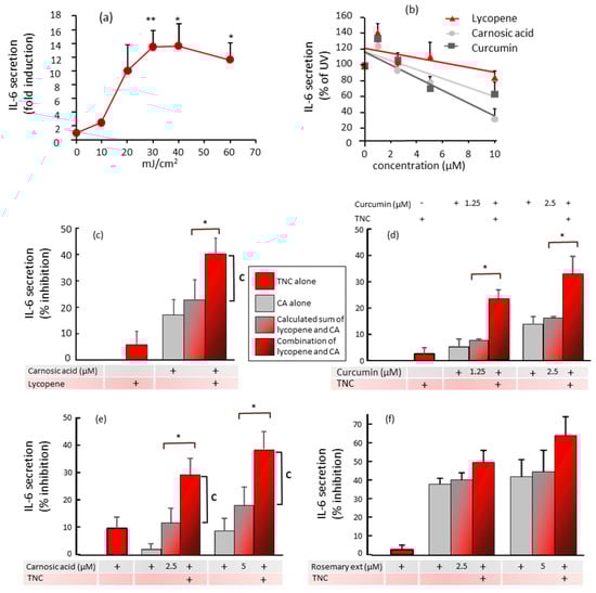 Inhibition of UVB-induced IL-6 release by combination of lycopene with carnosic acid or curcumin. (a) The release of IL-6 from HaCaT cells depends on the UVB dose. HaCaT cells were irradiated in PBS with the indicated UVB doses, and IL-6 release was measured in the medium as described. The results were normalized to cell number, which was estimated by the crystal violet method. Values are the means ± SEM of 2–16 experiments, each done in triplicate. * p < 0.05, ** p < 0.01 significantly different from non-irradiated cells; (b) Inhibition of UVB-induced IL-6 release by phytonutrients is dose dependent. The cells were irradiated as in (a) at 20–60 mJ/cm2 and treated with the indicated concentrations of the phytonutrients. As the percentage inhibition by the phytonutrients was similar at different UV doses, the statistics of inhibition was calculated on all results at UV doses from 20 to 60 mJ/cm2. Values are the means ± SEM of 2–20 experiments; (c–f) Inhibition of UVB-induced IL-6 release by various combinations of carotenoid and polyphenol preparations. The release of IL-6 was induced by UVB (30 mJ/cm2), and the cells were treated as described in (b), with the concentrations indicated in each panel. The sum of the effects of each compound alone was calculated (