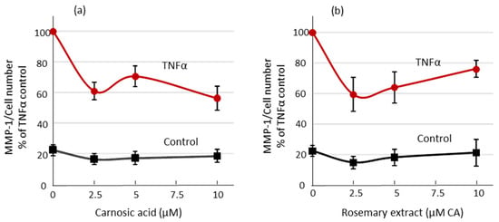 In the results described above, it was shown that phytonutrient combinations inhibited UV-induced NFκB activity and reduced the secretion of cytokines that were induced by this transcription system. Inflammatory cytokines such as IL-6 and TNFα induce the expression of matrix metalloproteinases (MMPs) [], which leads to the breakdown of collagen, the major structural component of the skin []. Thus, in normal human dermal fibroblasts (NHDFs), the effect of phytonutrients on cytokine-induced secretion of MMP-1 was checked. The pro-inflammatory cytokine, TNFα, increased the secretion of MMP-1 by about fivefold (Figure 3). Pre-treatment of the cells with carnosic acid resulted in a dose-dependent reduction in the MMP-1 protein level (Figure 3a). Treatment of the fibroblasts with rosemary extract containing the same concentrations of carnosic acid produced a similar reduction in the MMP-1 protein level (Figure 3b).