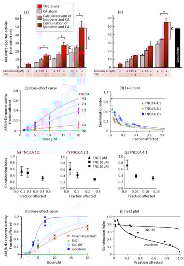 ). * p < 0.05 indicates that the combination is significantly different from the sum of each compound alone. The vertical line marked “C” indicates ARE/Nrf2 induction by the combination that is above the calculated sum of the induction by the separate compounds. (c–g) Combination index calculations of the synergy between TNC and carnosic acid. Different concentrations of TNC, carnosic acid, or their combinations at the ratios indicated in the figure were added 6 h after transfection. (c) Dose-effect curve at concentrations of 1.25–20 µM and at TNC:carnosic acid ratios of 1:1, 2:1, and 4:1. The µM concentrations shown on the x-axis are of each of the compounds alone or of carnosic acid in the combinations. Results are from two experiments, each done in triplicate. (d) Fraction affected-combination index plots of the data presented in (c). (e–g) Average CI values for the TNC–carnosic acid combinations. (h,i) Different concentrations of lycopene in TNC, carnosic acid in rosemary extract, or their combinations at a ratio of 4:1 were added 6 h after transfection. (h) Dose-effect curve at concentrations of 1.25–20 µM and at TNC:carnosic acid ratios of 4:1. The µM concentrations shown on the x-axis are of each of the compounds alone or of carnosic acid (from rosemary extract) in the combinations. LycodermTM containing lycopene:carnosic acid at a ratio of 1.8:1 was added at the indicated concentrations of carnosic acid. (i) Fraction affected-combination index plot of the data presented in (h).