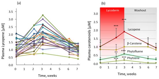 The results of the above experiments suggest beneficial effects of phytonutrient combinations for the skin. However, these results were obtained in in vitro experiments; thus, there was a need to prove these effects in a human setting. To assure that such clinical experiments are feasible, the human bioavailability of carotenoids found in TNC for skin (LycodermTM) was analyzed. Twenty-three volunteers (aged 24 to 33, 10 men and 13 women) were recruited for the study, conducted as described in the Materials and Methods section. They consumed two capsules of LycodermTM per day at two fat-containing meals. The amounts consumed per day of the main phytonutrients in the complex were 15 mg lycopene, 5.9 mg phytoene plus phytofluene, 0.9 mg β-carotene, and 4 mg carnosic acid (as rosemary extract). Blood withdrawal was done after a 12-h fast at time zero and at two and three weeks after beginning supplementation. The participants tolerated the supplement well, and no adverse effects were recorded. There was substantial between-subjects variability in the baseline concentrations of the studied phytonutrients (lycopene, phytoene, phytofluene, and β-carotene), and in the time course and maximal value of their concentrations following multiple oral administration of the supplement (shown for lycopene in Figure 5a; the numerical values of individual concentrations of all tested carotenoids are found in Tables S1–S4 in the Supplementary Materials). The baseline levels for lycopene ranged from 0.5 to 2.0 µM, and its maximal levels ranged from 0.6 to 3.2 µM. A statistically significant and linear increase in the average plasma lycopene, phytoene, and phytofluene was observed after two and three weeks of supplementation (Figure 5b), which for lycopene reached a maximal level of 1.9 ± 0.6 µM. Although the amount of β-carotene in the supplement was only 0.9 mg per day, a small but statistically-significant increase was evident at week three. Steady-state concentrations were still not attained after two weeks of treatment, and it is not clear if they were attained after three weeks. However, from similar experiments (Sharoni, Y., unpublished), we know that steady-state levels are usually achieved after three weeks or sooner. Carotenoid plasma concentrations were measured again, three and four weeks after the end of supplementation, and they returned to baseline values after four weeks.