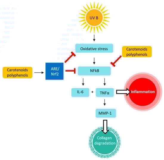 A model summarizing the suggested role of the studied parameters in the skin-damaging effects of UV irradiation. UVB irradiation causes oxidative stress and leads to activation of the NFκB transcription system, which results in induction of various inflammatory cytokines including IL-6 and TNFα. These cytokines lead to skin inflammatory responses such as erythema. TNFα induces the expression of MMP-1, which leads to collagen degradation and to decreased skin elasticity. Carotenoids and polyphenols inhibit NFκB and induce ARE/Nrf2. Activation of the ARE/Nrf2 transcription system by phytonutrient combinations can reduce UV-induced oxidative stress, which may partially explain the attenuation of UV-induced adverse effects.
