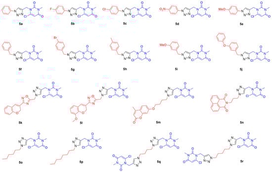 The target compounds 5a–r (Scheme 1) were synthesized using previously reported literature methods [38,39]. The required aromatic azides 2a–e and benzyl or alkyl azides 2f–r were first synthesized by the reaction of aromatic anilines 1a–e with dil. HCl and NaNO2 in water at 0–5 °C, followed by the addition of sodium azide in water at room temperature. The benzyl and other alkyl bromides 1f–r were made to react with sodium azide to give azide reactants 2f–r by the replacement of the terminal bromide. Finally, Cu(I) catalyzed coupling reactions between 6-chloro-3-methyl-1-(prop-2-yn-1-yl)pyrimidine-2,4(1H,3H)-dione (4) and the aromatic/benzyl/alkyl azides 2a–r was achieved by refluxing in DMF at 80 °C for 12 h to produce the target compounds 5a–r. As a representative case, the spectral analysis of compound 5e is discussed below.