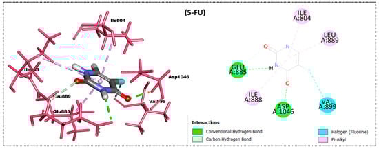 The reference drug, 5-FU produced a binding affinity of −65.73 kcal/mol. The interactions of the reference drug with the target protein are depicted in Figure 3. The –NH and carbonyl groups of the uracil moiety were stabilized by conventional hydrogen bonds with amino acid residues Glu885 (2.37 Å) and Asp1046 (2.03 Å), respectively. The fluorine atom of the uracil core interacted with the amino acid Val899. Further, the uracil nucleus is anchored by π-alkyl interactions with the amino acids Ile888, Ile804 and Leu889.