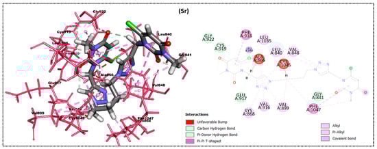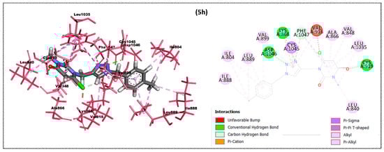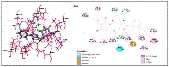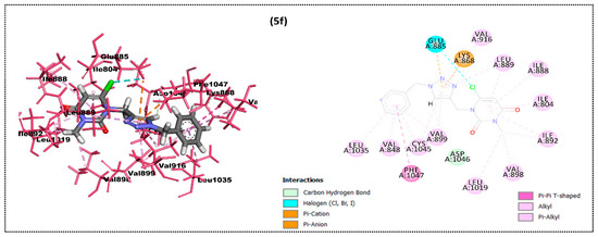 Compound 5f produced a binding affinity of −112.05 kcal/mol and the corresponding interactions are presented in Figure 5. The uracil moiety is anchored by π-alkyl interactions with the Leu889, Ile804, Ile888 and Ile892 residues. The chlorine atom of the uracil ring interacted with the carboxyl group of the Glu885 amino acid. The methyl group present on the nitrogen of the uracil ring settled in the hydrophobic pocket formed by the Ile892, Val898 and Leu1019 residues. The triazole ring is located in the hydrophobic pocket formed by Val916, Leu889, Val899 and Cys1045 with π-alkyl interactions. The hydrogen atom of the triazole ring is bonded to the carbonyl oxygen of the Asp1046 residue. Further, the triazole moiety is stabilized by π-cation and π-anion interactions with the amino acids Lys868 and Glu885, respectively. The appended benzyl ring of 5f is stabilized via π-π interactions with Phe1047 and π-alkyl interactions the with amino acid residues Val848, Val899, Leu1035 and Cys1045.