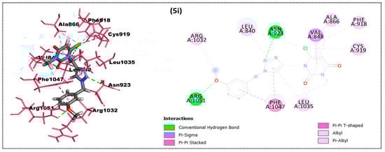 Compound 5i showed a binding affinity of −118.52 kcal/mol and the corresponding interactions are depicted in Figure 7. It showed three conventional hydrogen bonds in the active site of the receptor protein. The nitrogen at the 2-positon of the triazole ring formed a hydrogen bond with Asn923 with a bond distance of 2.48 Å. The oxygen of the appended benzyl group produced two hydrogen bonds with Arg1051 forming a stable six-membered ring with bond distances of 2.16 and 2.37 Å. The chlorine atom of the uracil moiety produced four hydrophobic interactions with the amino acids Leu840, Cys919, Phe918 and Ala866. The uracil core is anchored by π-alkyl interactions with Leu1035, Ala866 and Val848. N-methyl group of uracil ring interacted with Val848 and Phe1047 via alkyl and π-alkyl interactions. The triazole ring is stabilized by Leu1035 and Leu840 though π-alkyl interactions and Phe1047 with π-π interactions. The appended benzyl ring showed a π-π interaction with the amino acid Phe1047.