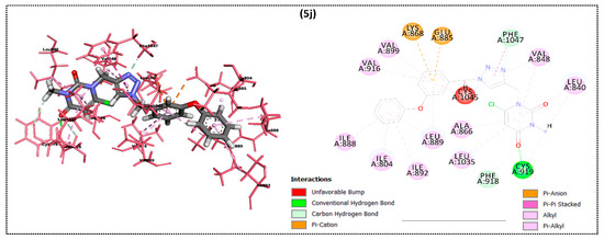 Compound 5j produced a binding affinity of −152.32 kcal/mol and the corresponding interactions are presented in Figure 8. It produced two hydrogen bonds in the active region of the target protein. The carbonyl oxygen of the uracil ring formed two hydrogen bonds with Cys919 and Phe918 with bond distances of 1.61 and 2.93 Å, respectively. The uracil core is anchored by π-alkyl interactions with Ala866, Val848, leu1035, Cys919 and Lue840. The N-methyl group of the uracil ring interacted with the Leu840 and Cys919 residues via alkyl interactions. The triazole ring is stabilized by π-alkyl interactions with Cys1045 and Val848 and π-π interactions with Phe1047. The appended benzyl ring showed a π-alkyl interaction with the amino acids Val916, Val899 and Leu889. Further, the benzyl ring is stabilized by π-cation and π-anion interactions with the amino acids Lys868 and Glu885, respectively. The phenoxy ring produced π-alkyl interactions with the amino acids Ile804, Leu889, Ile888 and Ile892.